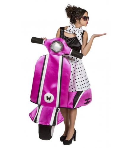 Este original y colorido disfraz de bella sobre ruedas ofrece una impresión de ir conduciendo una bonita vespa rosa. Disponible en talla única para adulto.