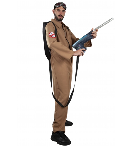 El traje contiene el mono completo con mochila y pistola. Asimismo, se encuentra disponible en tallas 42, 48 y 52 para adulto y está fabricado en material de tela. El mono es de color marrón, como se muestra en las imágenes, con el identificativo de los auténticos Cazafantamas en el lateral de una manga.